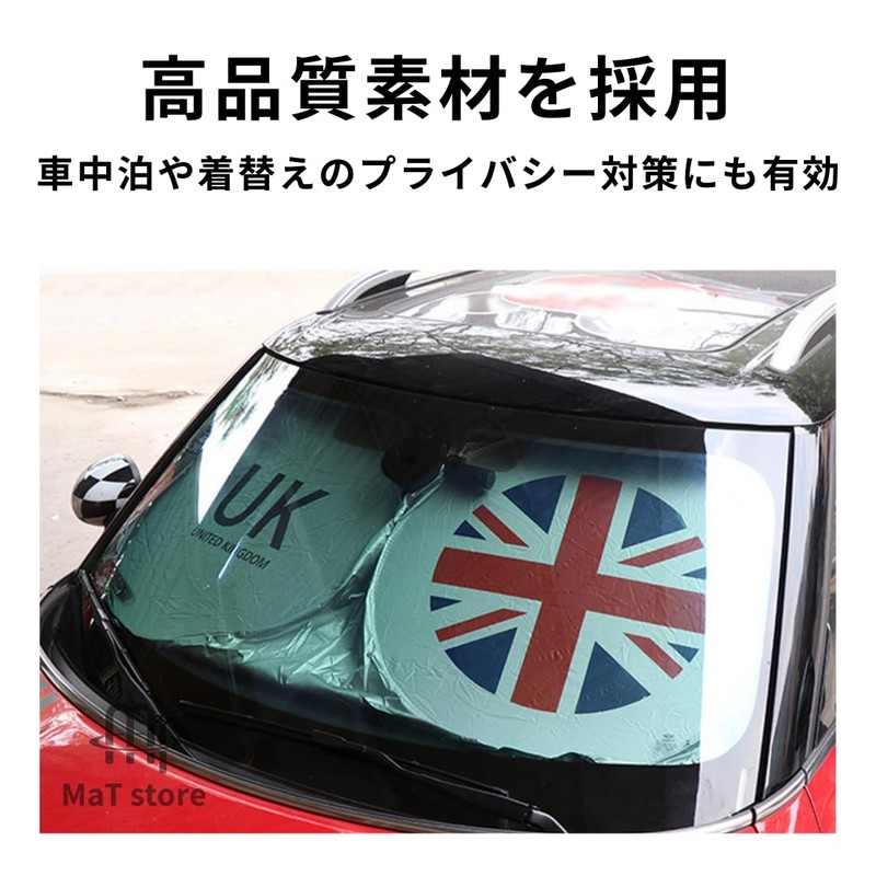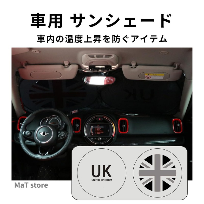 - (Car Sun Shade) A must-have item in summer to prevent the temperature of your car from rising in the car. The union jack pattern fits perfectly into the mini cooper and reflects sunlight, preventing heat rising and damaging UV rays
