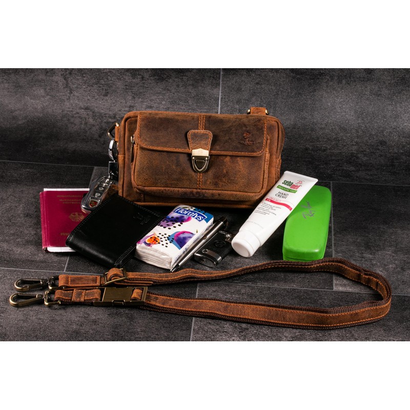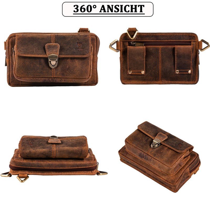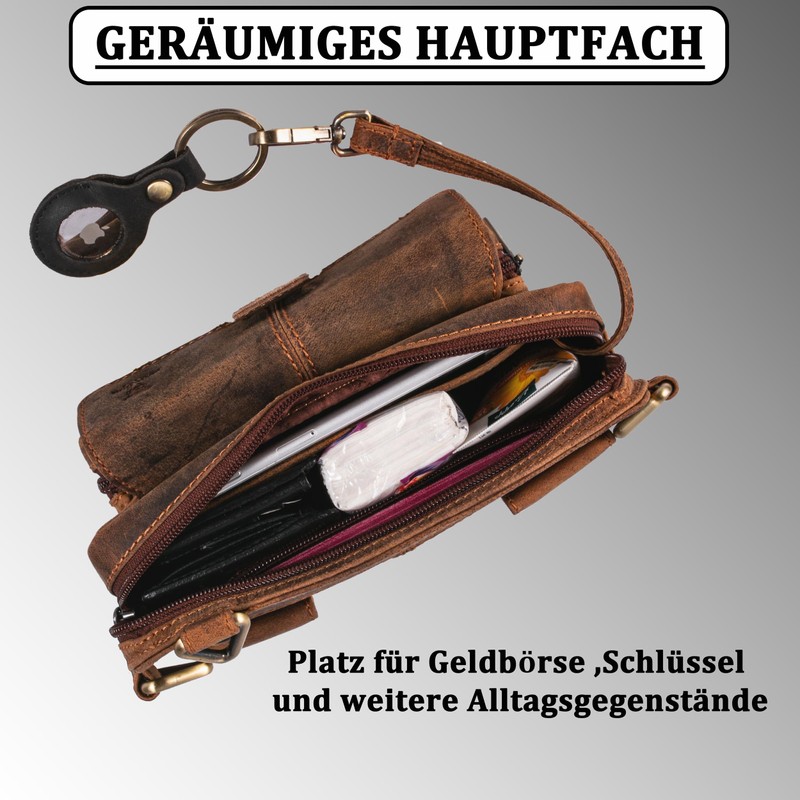 - Clear organisation: 1 large main compartment with zip compartment, 1 outer compartment/mobile phone pocket on the front with zip and snap closure, as well as 1 zip pocket on the back make this leather case a real all-rounder.