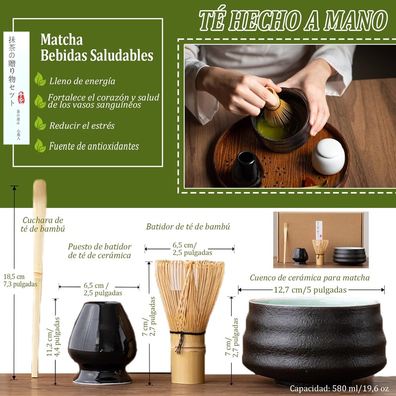- Juego de Regalo Matcha Set:Este maravilloso juego de matcha,muestra una artesanía exquisita en cada herramienta. Bellamente empaquetado y fabricado con materiales de alta calidad, es el regalo perfecto para días festivos, cumpleaños o cualquier ocasión especial. Adecuado tanto para entusiastas experimentados como para principiantes, combina a la perfección estilos tradicionales y modernos.