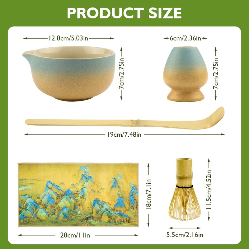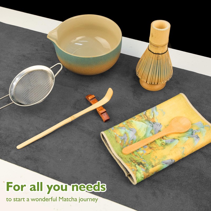 - Exquisite Matcha Set: Our 8-piece Matcha Set includes: 1* whisk, 1* spoon, 1* stainless steel sieve, 1* 500 ml/17 oz ceramic matcha bowl (tea bowl), 1* ceramic whisk stand, 1* cotton tea towel, 1* matcha stand