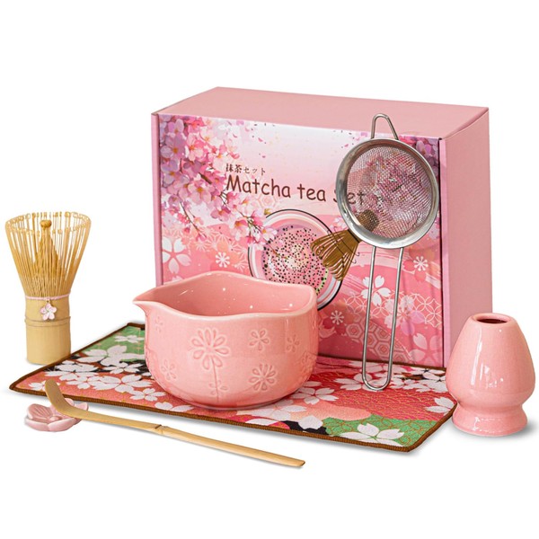 Matcha Set, Matcha Whisk Set Includes 15.2oz Matcha Bowl with Spout,Matcha Whisk,Chasen Holder, Scoop, Sifter, Towel - 7 Pcs Pink Glaze Ceramic Matcha Kit for Matcha Lover