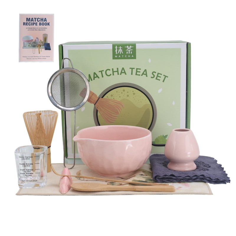 - Complete 10-Piece Matcha Whisk Set in Sakura Pink Theme: Start your matcha ritual with a beautifully coordinated set featuring a sakura pink 18.5oz ceramic bowl, bamboo whisk, scoop, measuring spoon, ceramic whisk holder, scoop stand, matcha powder sifter, two tea cloths, and a 2oz glass measuring cup. A charming all-in-one kit for both beginners and devoted matcha lovers