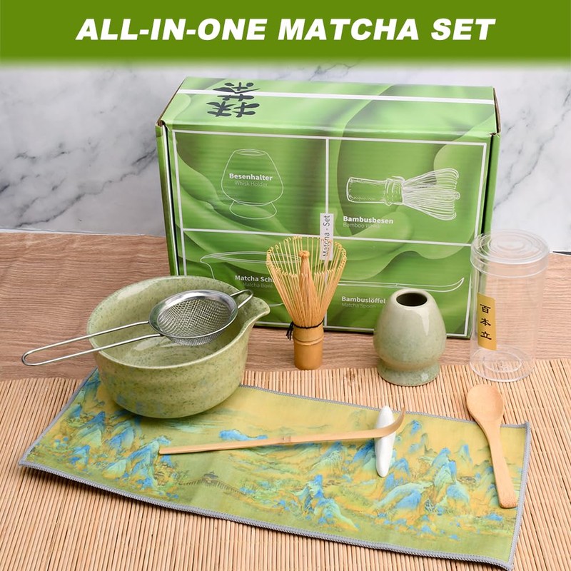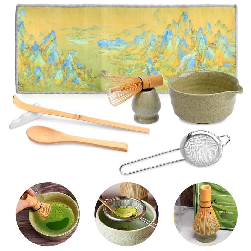 The integrated matcha whisk set includes 8 essential tools: bamboo whisk, bamboo spoon, spoon holder, stainless steel sieve, ceramic matcha bowl, whisk holder, tea spoon, and tea towel.