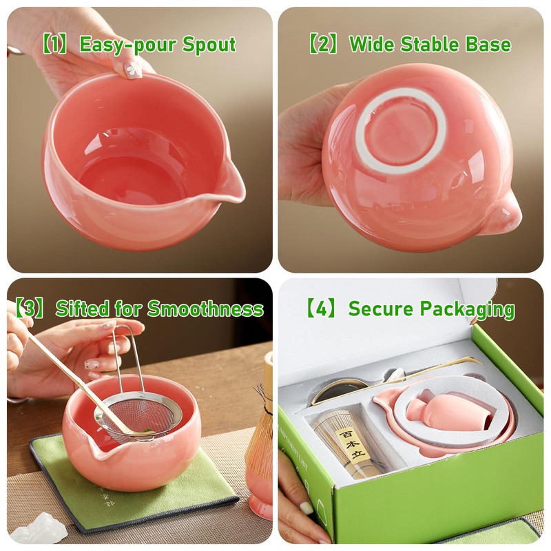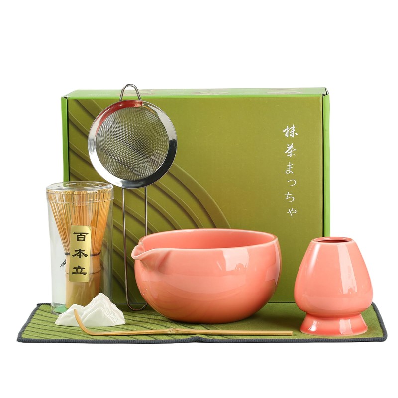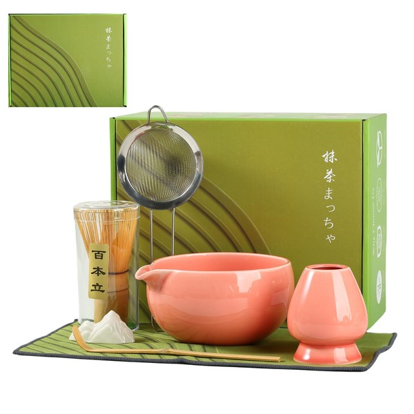 - 7-Pcs Matcha Whisk Set Include: 1*500ml/18oz Ceramic Matcha Bowl with Spout (chawan) , 1*Bamboo Whisk, 1*Bamboo Scoop (chashaku), 1*Cermaic Whisk Holder, 1*Ceramic Scoop Stand, 1*Cotton Tea Cloth (chakin), 1*Matcha Powder Stainless Sifte