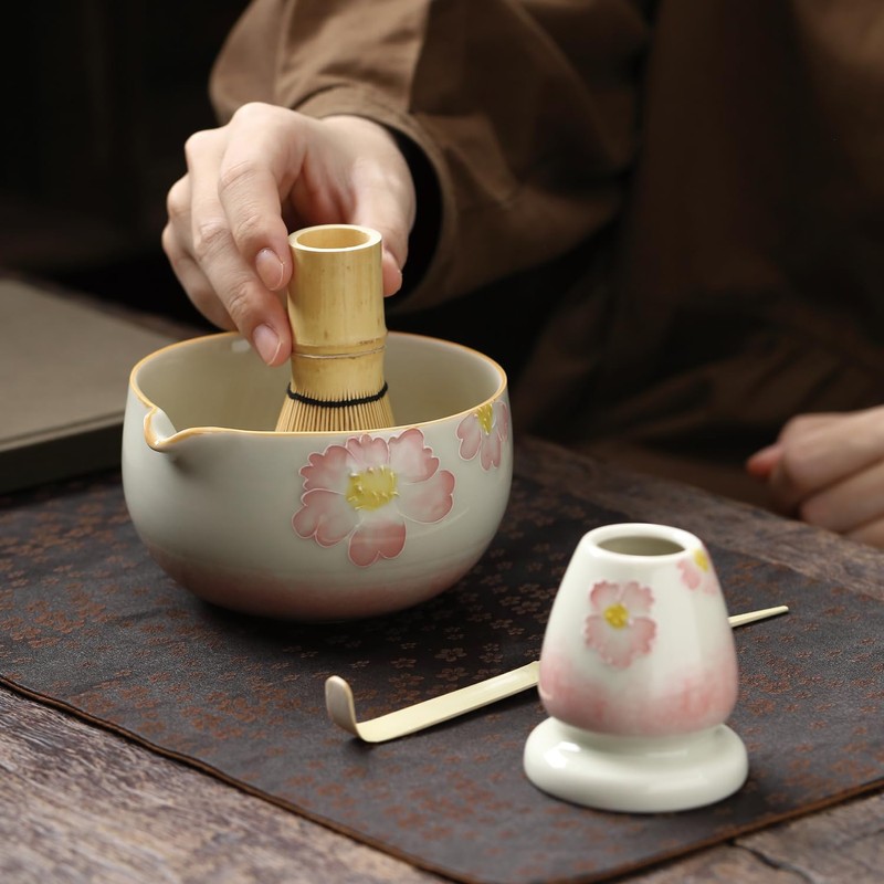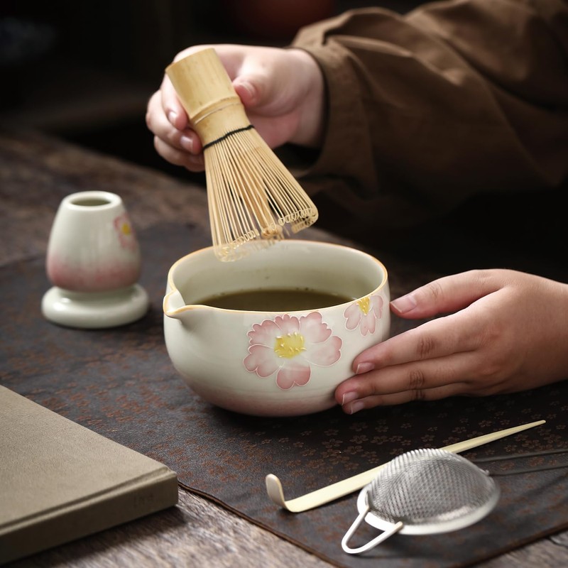 Matcha Whisk Set, Matcha Set Includes Matcha Bowl, Bamboo Matcha Whisk, Whisk Holder, Sifter, Bamboo Scoop - 5 Pcs Perfect Matcha Kit for Matcha Lover and Tea Ceremony (Cherry Blossom)