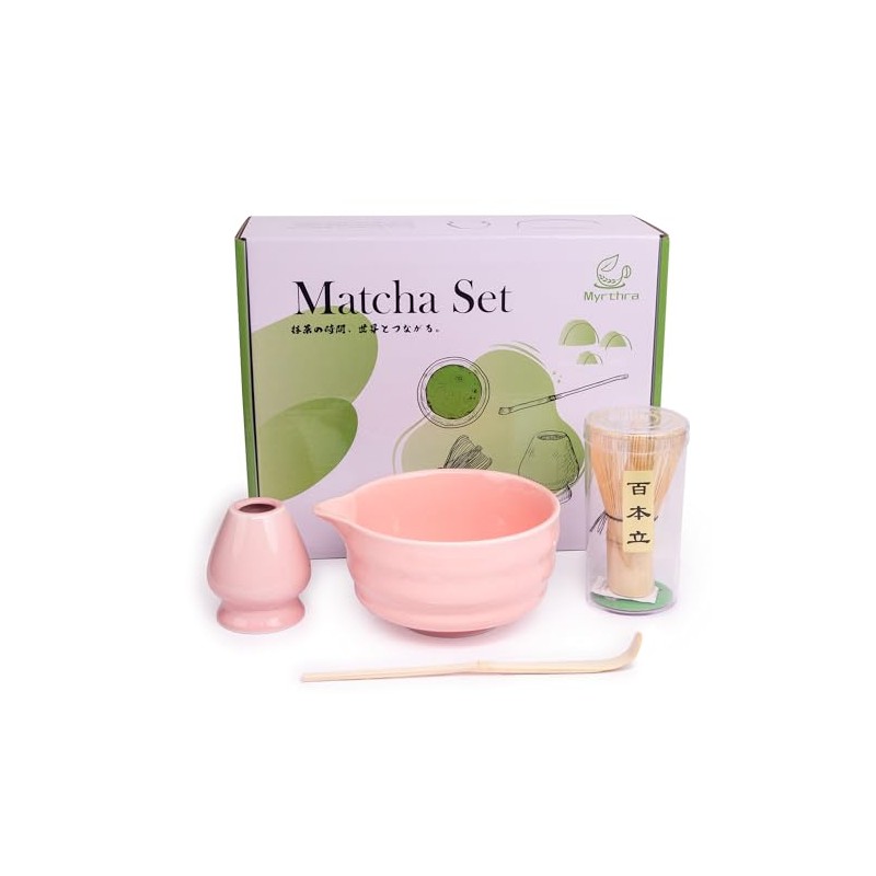 Matcha Whisk Set, Myrthra Matcha Set Includes Matcha Whisk and Bowl (Bowl with Spout), Holder and Scoop-4PCS Matcha Tea Set (Pink)