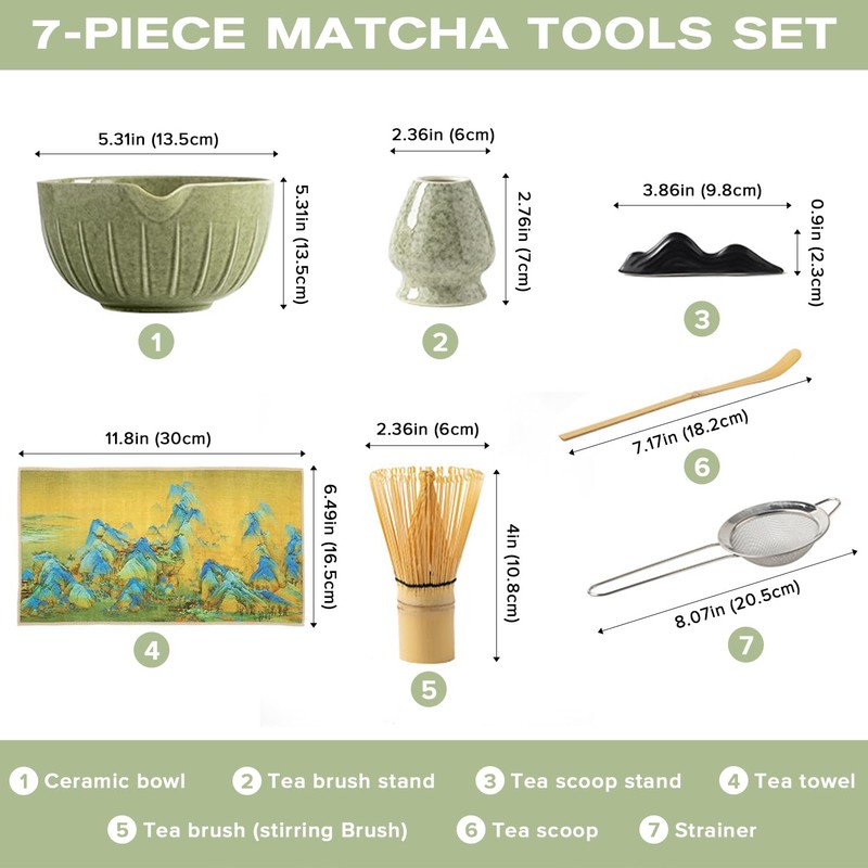 - 【Complete Matcha Kit】This all-inclusive matcha set has everything you need for an authentic matcha experience: 1×Bamboo Matcha Whisk (Chasen), 1×Bamboo Scoop (Chashaku), 1×Scoop Rest, 1×Stainless Steel Sifter, 1×530ml (18oz) Ceramic Matcha Bowl with Spout(Chawan), 1×Whisk Holder, 1×Tea Towel. Each piece is meticulously crafted to bring effortless style to your matcha ritual.