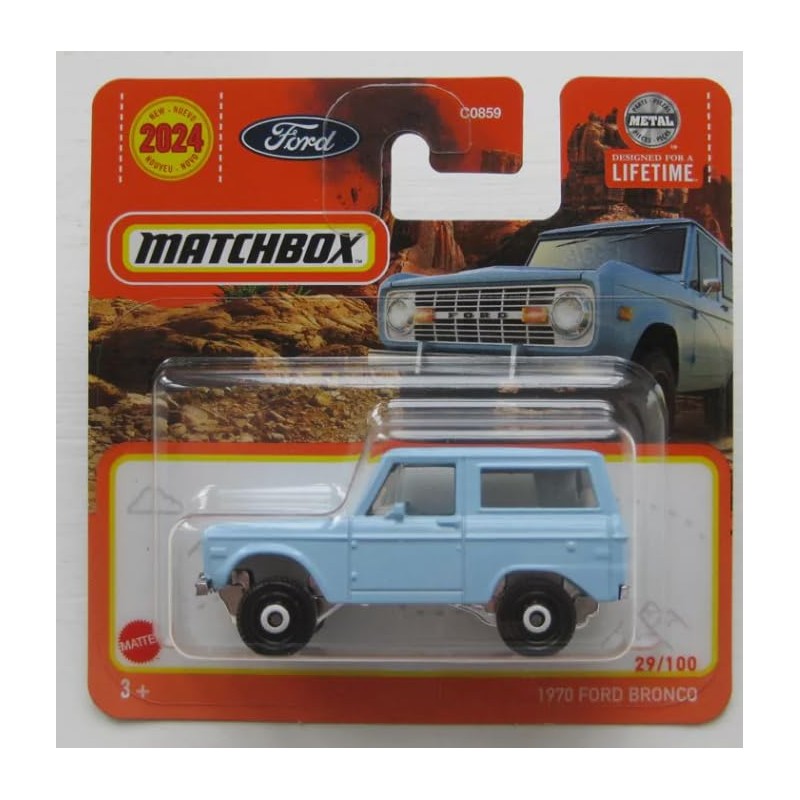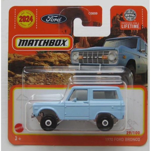 This Matchbox model is a detailed replica of the 1970 ford bronco 29/100 1:64. As part of the popular Matchbox range, it is an essential collector's item for car lovers and model car enthusiasts. The vehicle is made in 1:64 scale and measures approximately 7.5 cm in length. The metal body and moving wheels give the model an authentic look. Whether as a toy for children or as a decoration for collectors, this miniature vehicle brings joy and makes the hearts of car fans beat faster. With its detailed design and sturdy workmanship, it is a must have for any Matchbox collection.