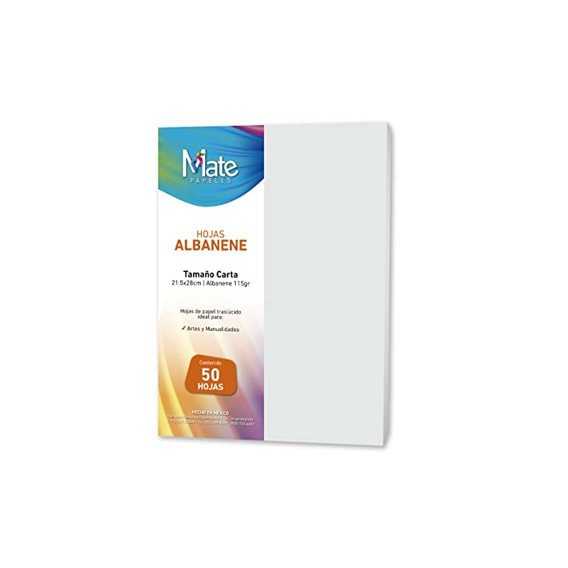 ¡Bienvenido a la tienda oficial de Cuadernos MATE! Paquete de Papel Albanene 115 g Ideal para artes gráficas, trabajos escolares, manualidades, entre otros. Incluye: -Paquete con 50 hojas -Medida: 21.5 x 28 cm -Papel Albanene de 115 g ¡Hecho en México! ¡Visita nuestra tienda en línea donde encontrarás todos nuestros productos siempre en existencia!