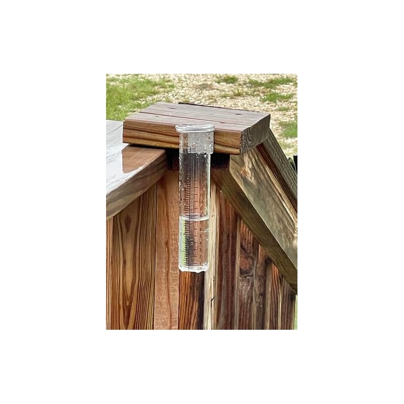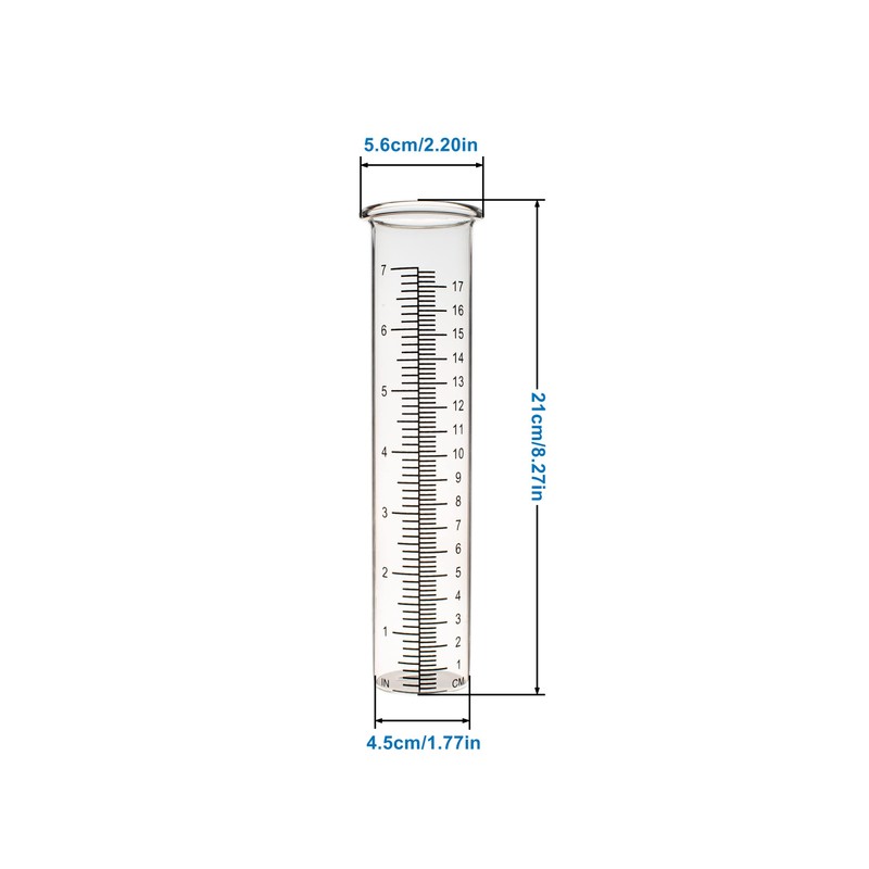 - Rain gauge dimensions - 2.25 W x 2.25 D x 8.27 H in/5.5 D x 5.5 Dx 21 H cm