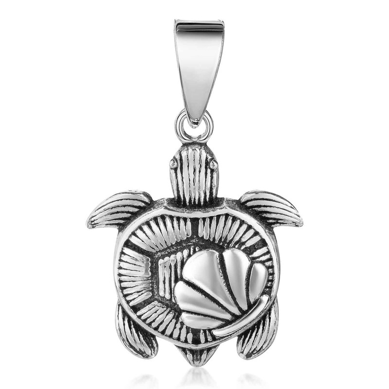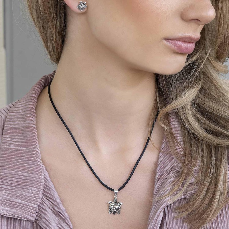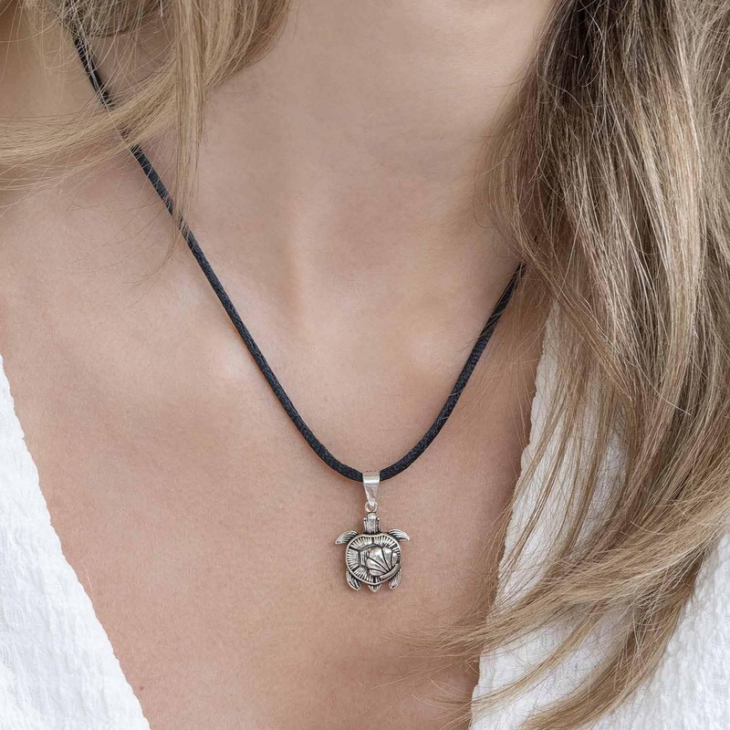 Our silver pendant in the shape of a turtle is decorated on the shell with a small shell. The pendant is made of 925 sterling silver and then antique oxidised to accentuate fine details. The piece of jewellery is suitable for all chains up to a maximum thickness of 4.2 mm. Optionally, the pendant is available in a set with a matching fabric band in different lengths.