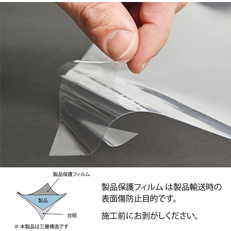 - 本製品は、保護フィルム(製品保護用)、プロテクションフィルム(貼付けフィルム)、剥離フィルム(台紙)の3層構造となっております。貼り付け前に糊面側の確認をお願いいたします。
