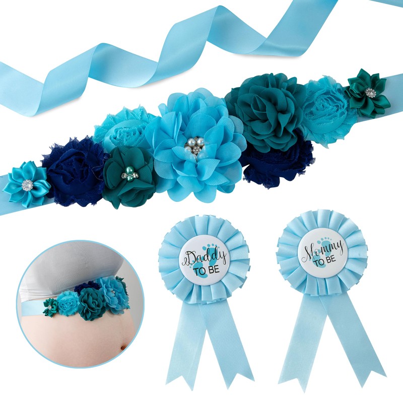 Maternity Sash & Pins Set Daddy to Be Corsage Mommy to Be Sash Pregnancy Sash Keepsake Baby Shower Flower Ribbon Belly Belt Pregnancy Photo Props (Sky Blue)