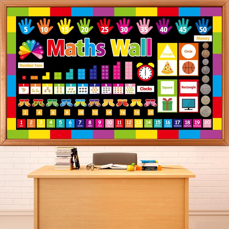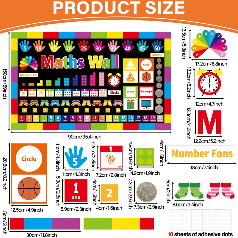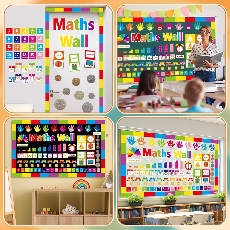 - Package includes: This math bulletin board set includes 9 "Maths Wall" letter cutouts, 87 math-themed cutouts featuring handprint, coin, geometric shape cutouts and more, and 16 bulletin board borders. It also comes with 200 adhesive dots for easy setup, making it ideal for any math classroom cutouts or back to school supplies.