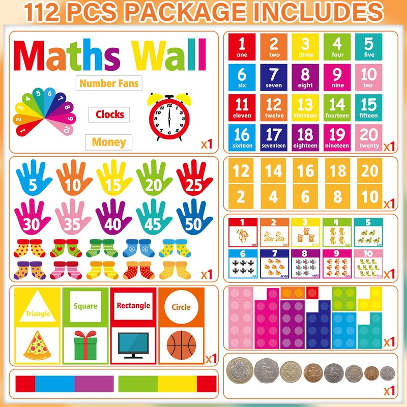 - Math design: The colorful mathematical knowledge posters feature handprint with multiples of 5, number fans from 1 to 10, along with clocks, coins, and geometric shapes. The vibrant layout visually reinforces key math concepts—numbers, money, and shapes—making it easier for young learners to grasp and stay engaged.