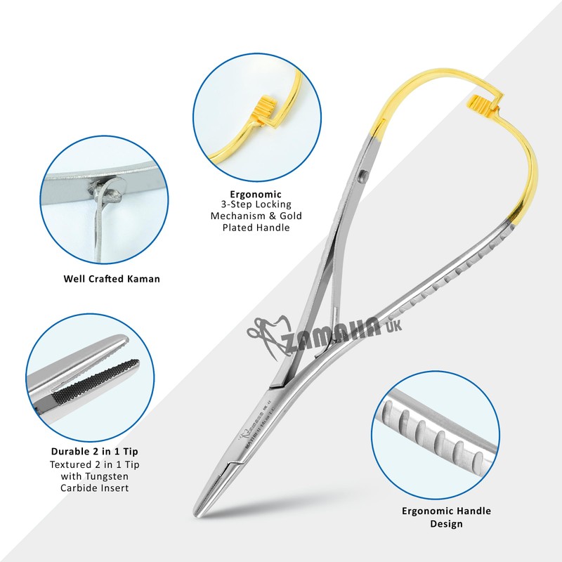 • Medical Grade Stainless Steel, High Quality made in Stainless Steel. Gold platted not color coated., Spring action between the holding parts facilitates quick working and time saving