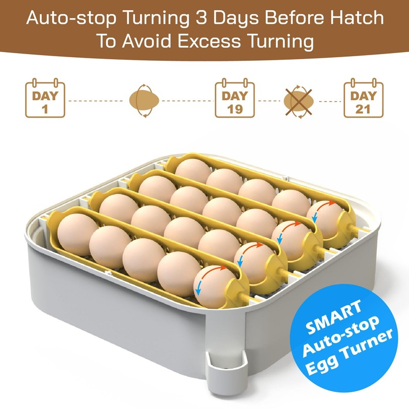 - 【AUTOMATIC EGG TURNER】: Side-to-side turning the eggs automatically at 60 minutes interval, and also can auto-stop turning 3 days before hatching to avoid excess turning.