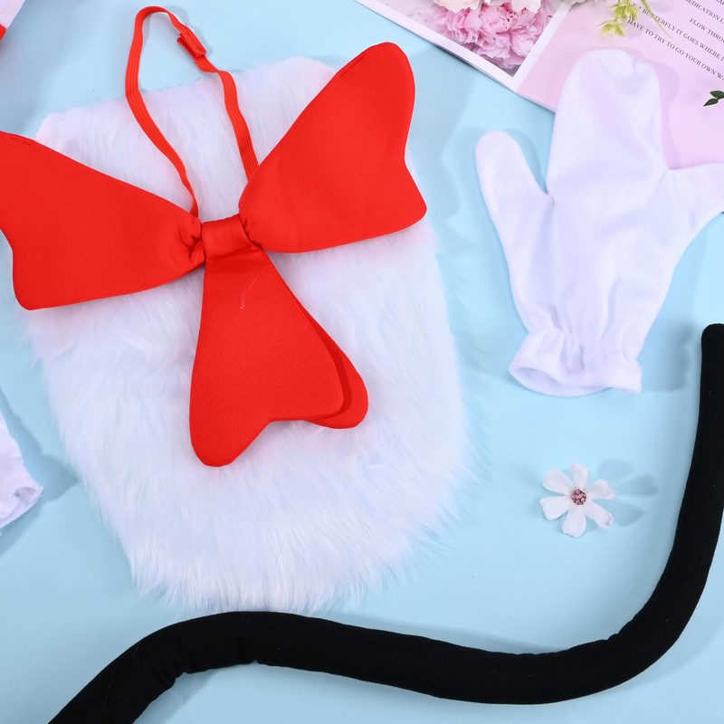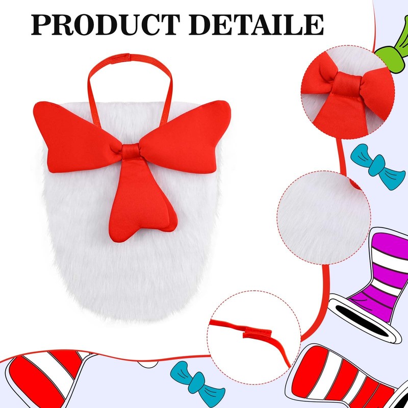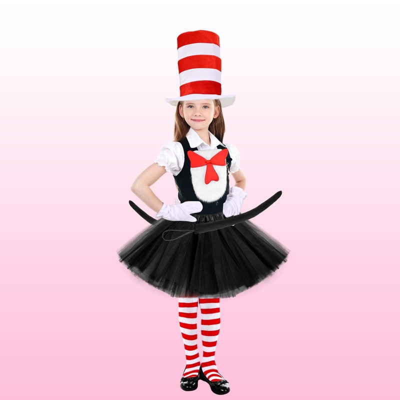 - 【Cat Costume Set】You will receive a red and white stripes top hat ,1 piece of black tutu skirt,1 pair of red white striped knee socks,a pair of white gloves,a long black furry tail and an oversized red bow tie with fur,can be given as a surprise gift to children, who can refuse such a cute and playful outfit,its a good addition to complete cat character outfit for your book day dress.