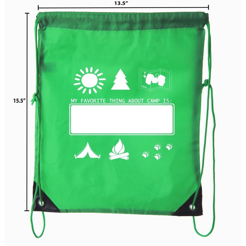 • Our Camp Swag Bags Measuring at 15.5 Inches X 13.5 Inches Camping Backpacks are great for organizing all your camping supplies, from toiletries, too Flashlights. Also great for Birthday Party favors and snacks! Pack your S’mores and flash lights and que the ghost stories!
