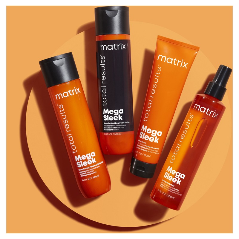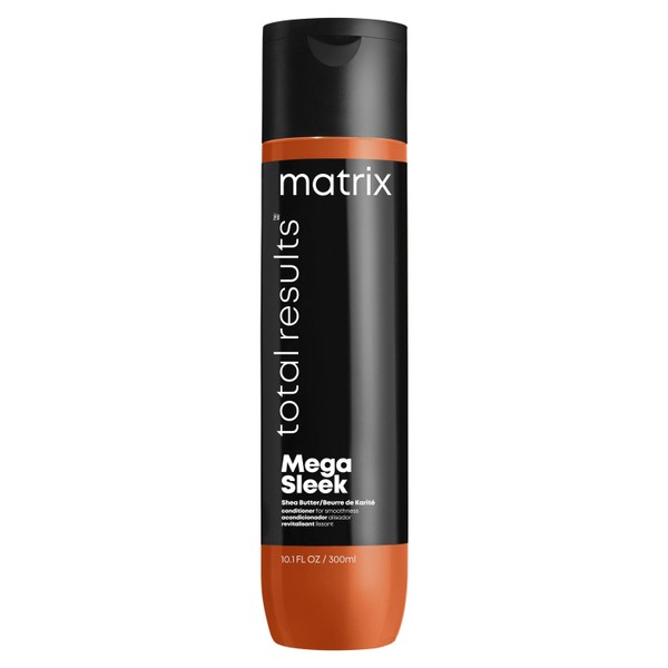 What are the benefits and features of Matrix Total Results Mega Sleek Conditioner 300ml?- Smoothing conditioner that helps control rebellious, unruly hair and manages frizz against humidity for smoothness.
