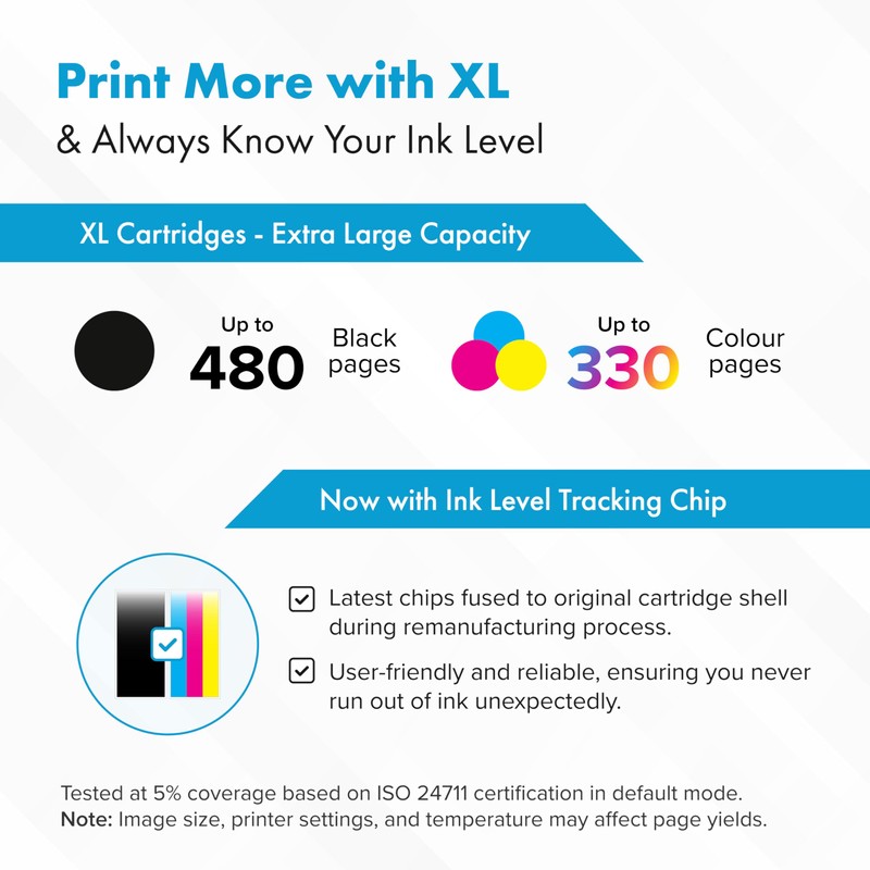 - High page yield: 480 pages for black ink cartridge, 330 pages for colour ink cartridges (A4 at 5% coverage) at 5% coverage of A4