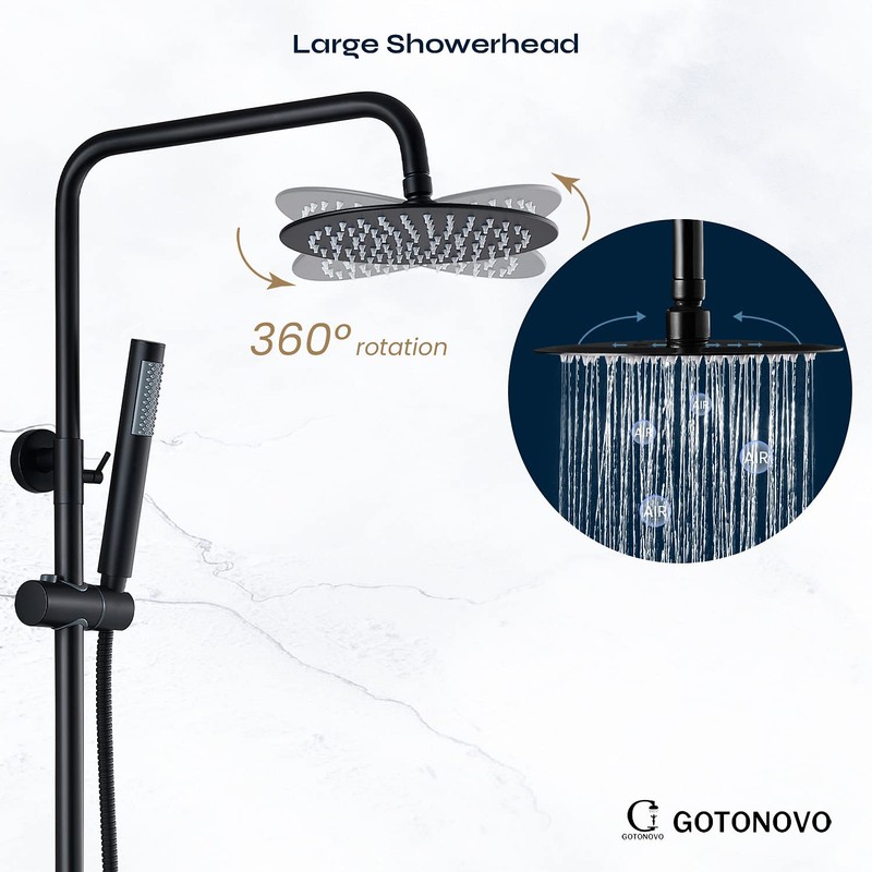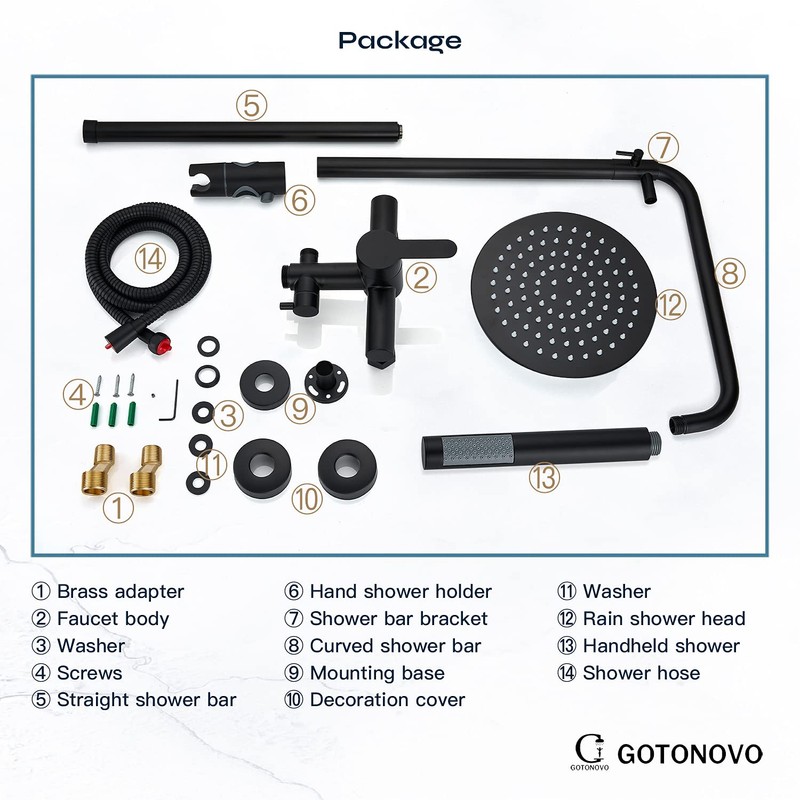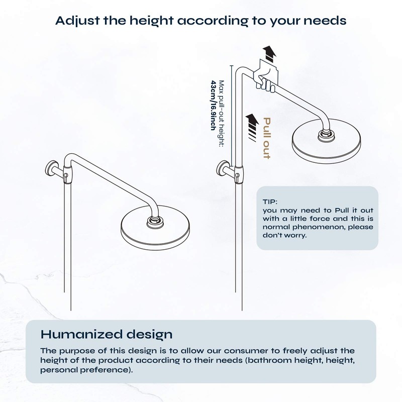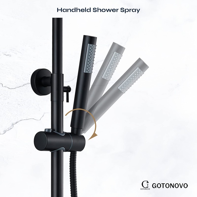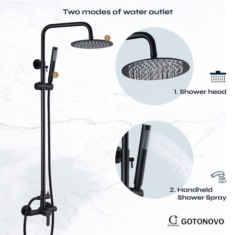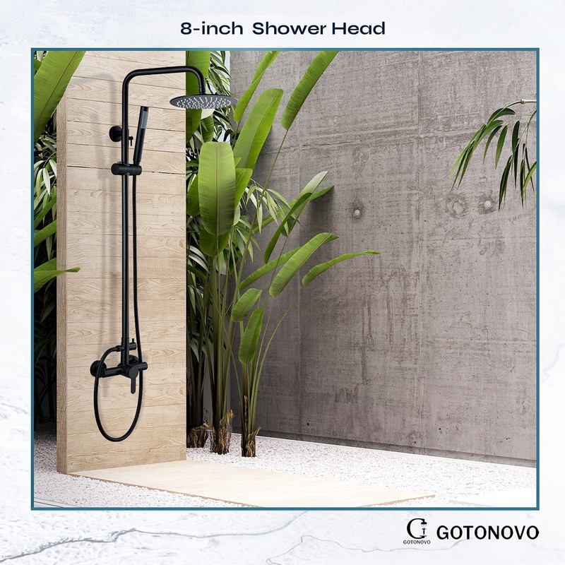 - Reliable Design:Adjustable height brass slide bar,8" rain showerhead,59” 304 Stainless Steel Shower Hose,single handle to control water and hot water