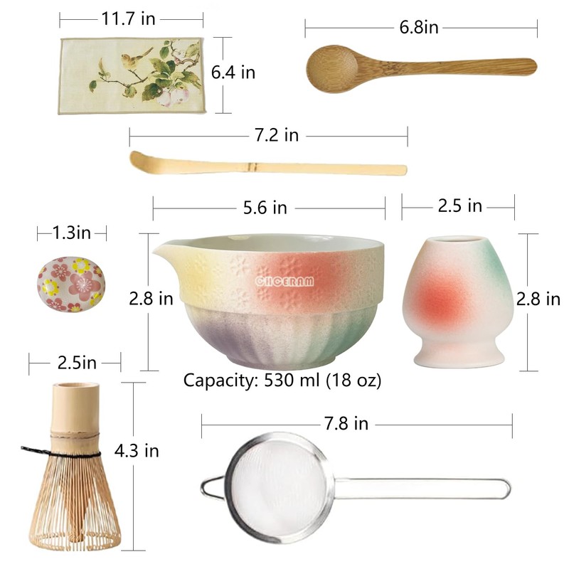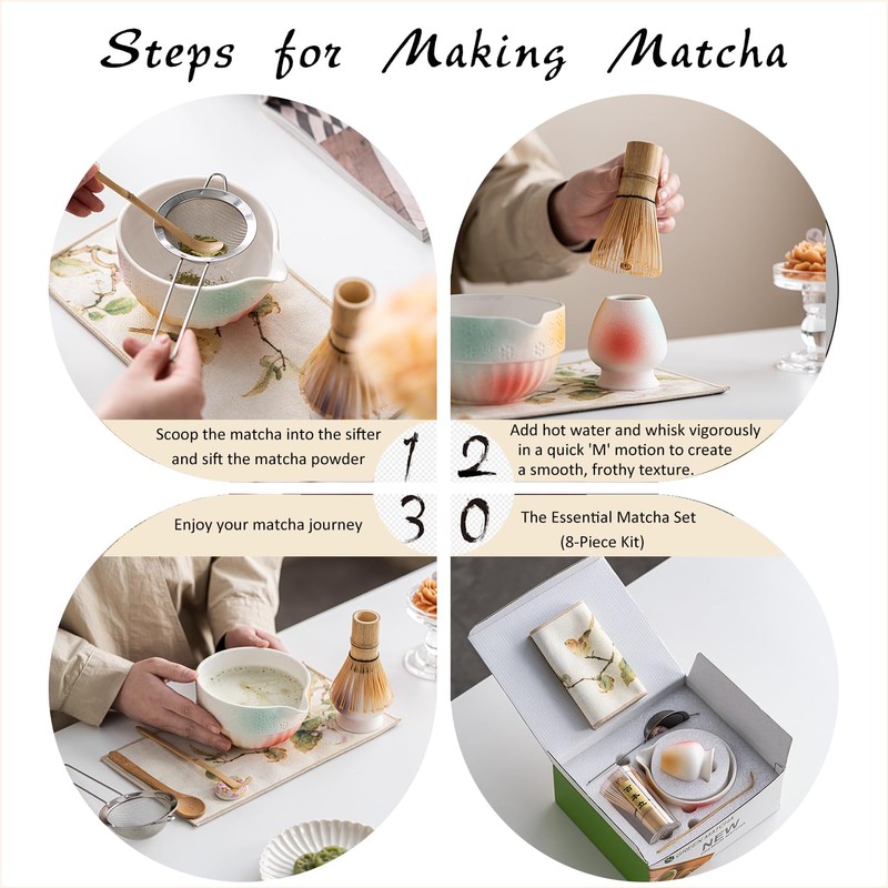 - What You Get: Complete Matcha 8-Pcs Kit! Includes 1 * ceramic bowl (chawan), 1 * bamboo whisk (chasen), 1 * whisk holder, 2 * bamboo scoop, 1 * scoop rest, 1 * sifter, 1 * tea towel. No extra purchases needed – just unbox, brew, and savor!