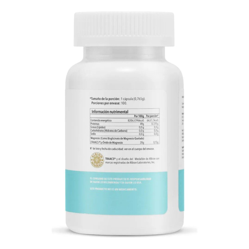 Cada frasco contiene 100 cápsulas con 150 mg de Magnesio Combinado.