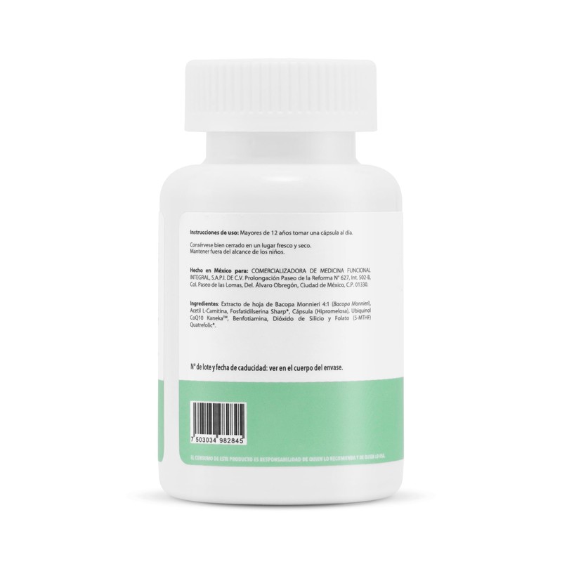 - Ingredientes por dosis diaria recomendada: Folato (5-MTHF) Quatrefolic 400 mcg por porción, Vitamina B1 (Benfotiamina) 14 mg por porción, Carnitina (Acetil L Carnitina) 150 mg por porción, Mezcla propia 0.5 g por porción: Extracto de hoja de Bacopa Monnieri 4:1 (Bacopa Monnieri), Ubiquinol CoQ10 KanekaTM, Fosfatidilserina SHARP