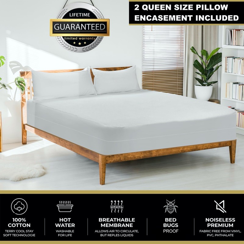 • 🔳 ULTIMATE BED PROTECTION KIT: Say goodbye to bed bugs with the Mattshield Ultimate bed bug mattress cover 3 Pieces Protection KIT - Queen Size ( 60" X 80" or 152 X 203.5 cm ), including Mattress Encasement and 2 Pillowcases Encasements with Zipper. Soft cotton surface and 100% waterproof for lifetime mattress protection.