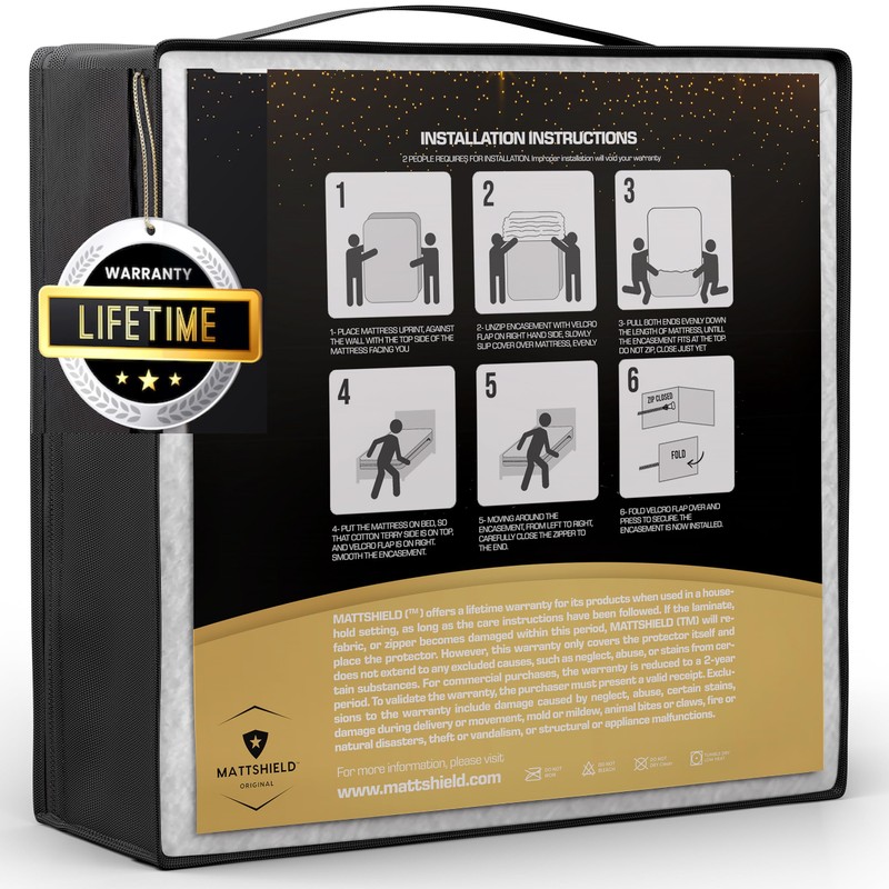 Welcome to the ultimate sleeping experience with the MATTSHIELD New Ultimate 3-Piece Kit. Carefully designed for premium bed protection, this kit includes a Queen,King, Twin, Full or California King Size Mattress Encasement and 2 Hypoallergenic Pillow Protectors, offering complete coverage against bed bugs and allergens. What sets us apart is the 100% waterproof barrier on all six sides of the mattress encasement. Whether it's an accidental spill or a dust problem, our cover ensures your mattress stays clean, dry, and in optimal condition. But protection doesn't mean compromising on comfort. The soft, cooling terry cotton fabric keeps you comfortable throughout the night, and its breathability ensures good temperature regulation, providing an undisturbed, restful sleep. Fitting mattresses up to 18 inches thick, the deep pocket design and secure zipper closure make installation a breeze. When it comes to maintenance, we've got you covered. The mattress encasement is machine washable, making care effortless. Simply toss it in the wash to maintain freshness and hygiene. At MATTSHIELD, we believe in the quality of our products. That's why we offer a worry-free Lifetime Warranty with every purchase. Make the right investment for your sleep hygiene with our ultimate protection kit, and experience the Mattshield difference. Don't compromise on your sleep. Add the MATTSHIELD New Ultimate 3-Piece Kit to your cart now for an unmatched, worry-free sleeping experience.