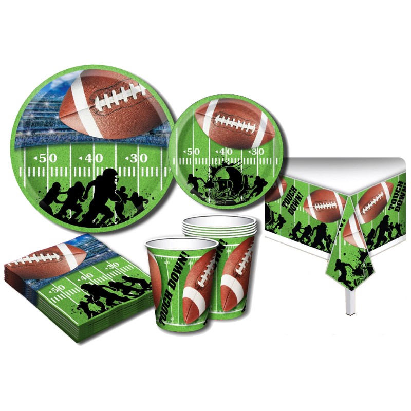 - The Deluxe Football Theme Party Supplies Pack is designed for your convenience. The disposable tableware makes cleanup a breeze, allowing you to spend more time enjoying the celebration and less time worrying about washing dishes. With no messy cleanup afterwards, you can focus on the game and spend quality time with your guests.