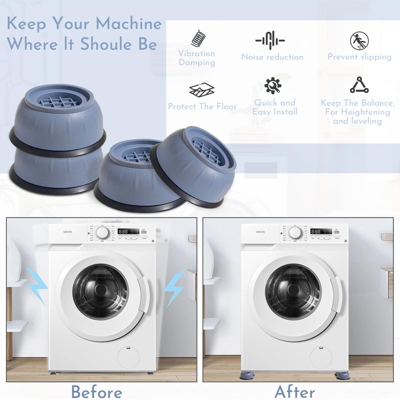 - Non-slip · Shockproof and noiseless: the groove design increases friction, the supports thanks to the suction cup shape with wide base prevent movement and provide protection for the floor. The widened support stabilises the washing machine to reduce vibration and noise. The pads insulate the foot of the device and the contact with the ground, so that these devices can have a great cushioning effect.