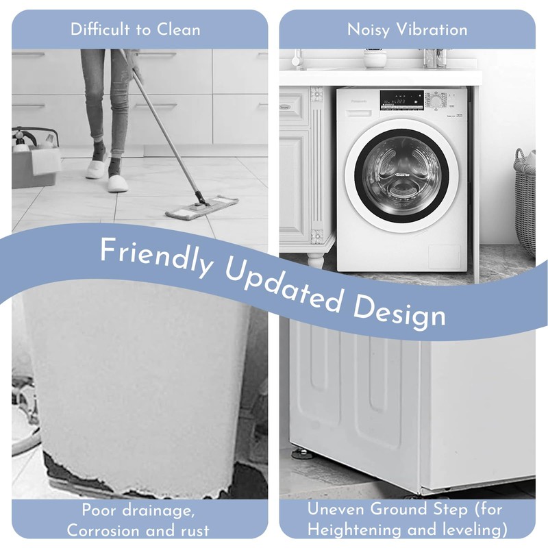 - Never been easier and more convenient: no tools or dirty glue, adhesives required. Simply lift each corner of the machine and slide the anti-vibration holder into place. The height of each footrest is 3.5 cm, with these feet, we can also increase the height of appliances and furniture, it runs smoothly, prevents it from getting wet, and is easier to clean.