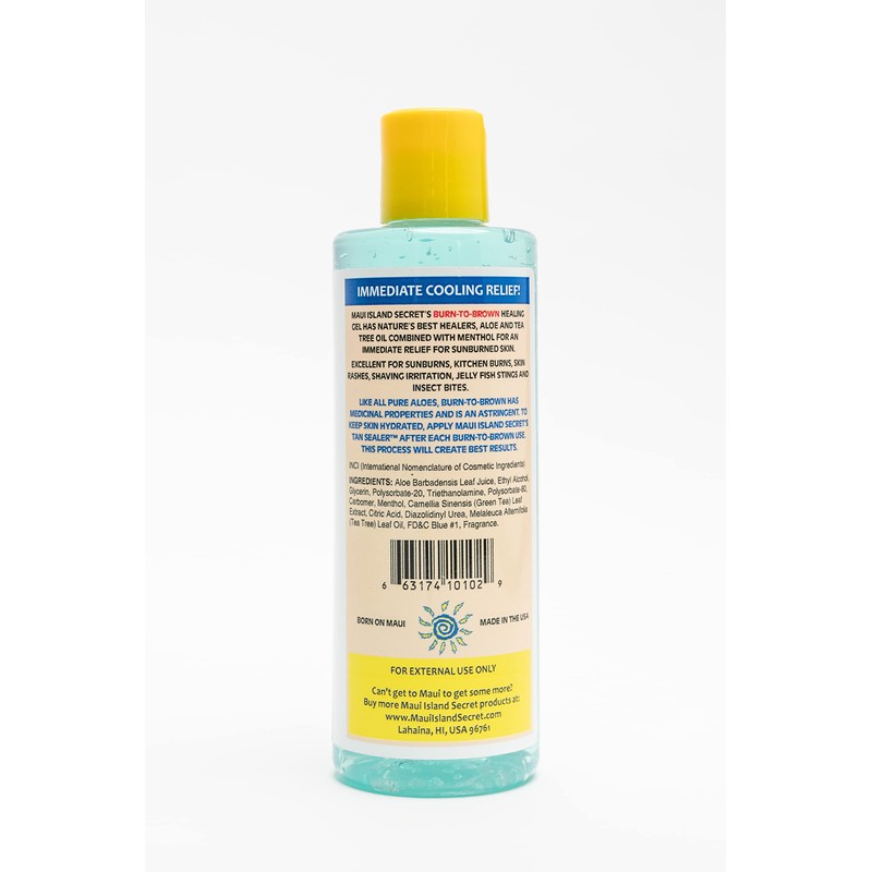 Our Burn-To-Brown healing gel has nature's best healers, aloe and tea tree oil combines with menthol for an immediate relief for sunburned skin. Not only is this great for sunburn, but keep it handy, it works great for kitchen burns, skin rashes, shaving irritation, jelly fish stings and insect bites.