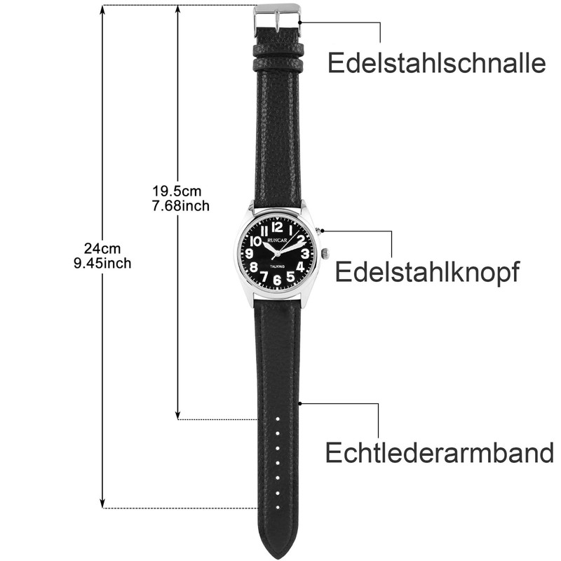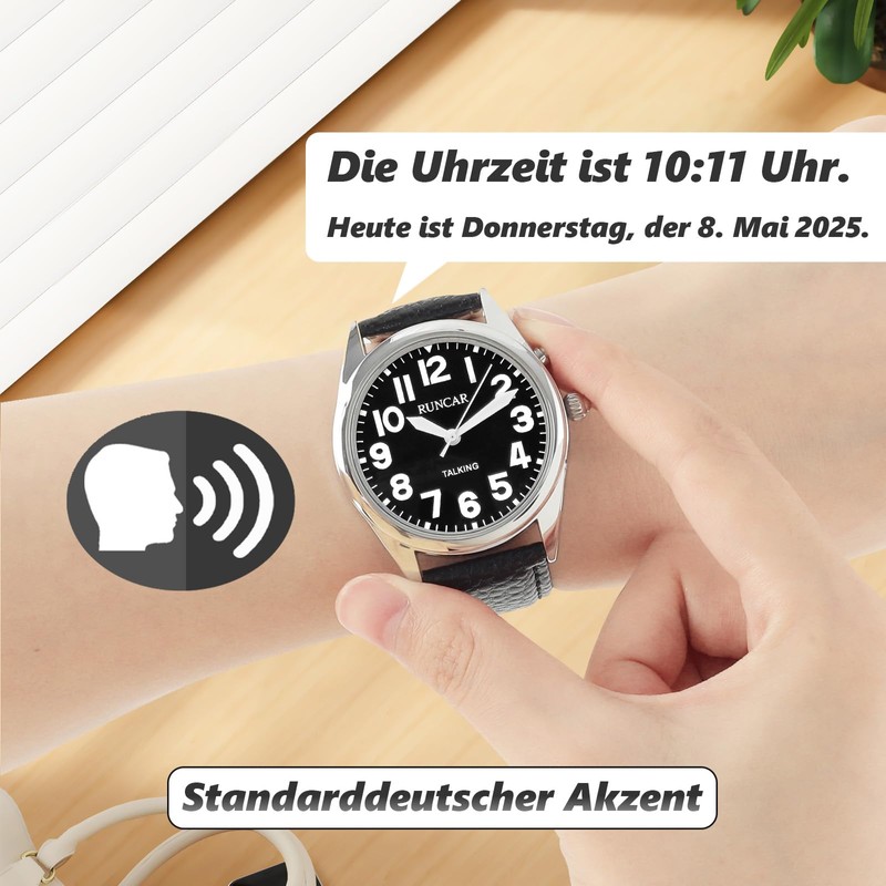 - Announcement of time and date: clearly hear the time, date or alarm time with pleasant German voice. If you are looking for talking watches for the blind, this talking watch will meet your needs! Set an alarm clock to notify you of taking medication, waking up or important appointments.