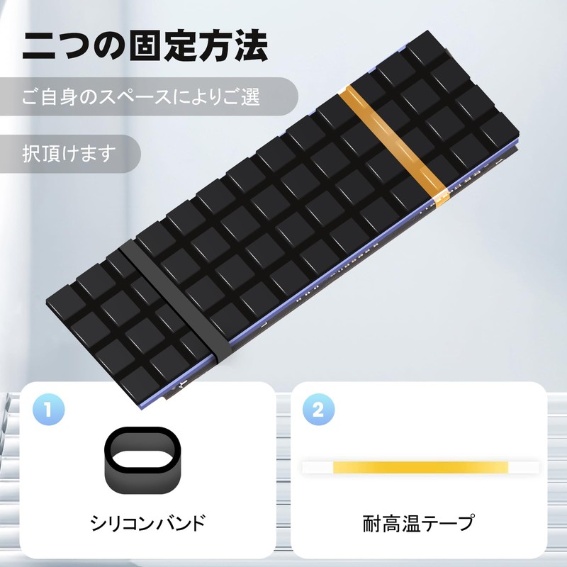 - 10°C-20°C Cooling Effect: 10~20°C cooling effect (depends on usage environment) eliminates the heat explosion of M.2 SSDs and maintains the high speed performance of the SSD. Attach the included thermal pad to the surface with the M2 SSD chip, then secure it with a silicone band or high temperature resistant tape to complete the installation