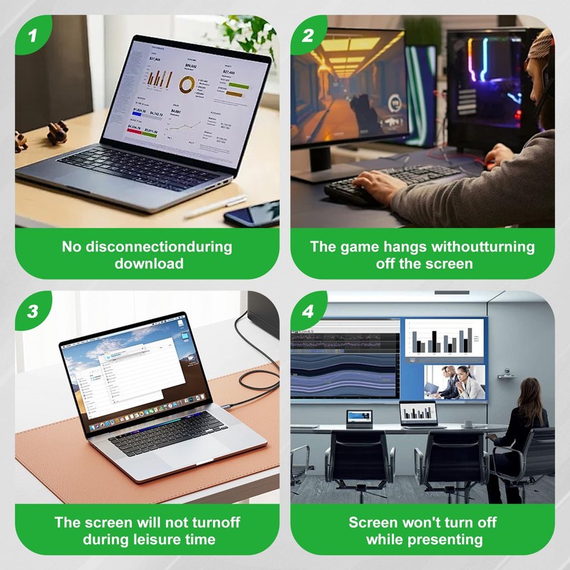 - Geeignet für mehrere Szenarien - Bei der Durchführung von Aufgaben wie Remote-Arbeit, Videokonferenzen, Online-Live-Streaming, AFK-Spielen (weg von der Tastatur) zum Aufleveln, Hoch- und Herunterladen von Daten und Ausführen von automatisierten Programmen müssen Sie Ihren Computer aktiv halten. Die Verwendung des Mausbewegers kann verhindern, dass der Computer in den Ruhezustand oder in den Bildschirmschonermodus wechselt, was zu unterbrochenen Konferenzen, unterbrochenen Dateiübertragungen oder abnormalen Programmabläufen führen kann, wodurch ein reibungsloser Arbeitsablauf gewährleistet wird.