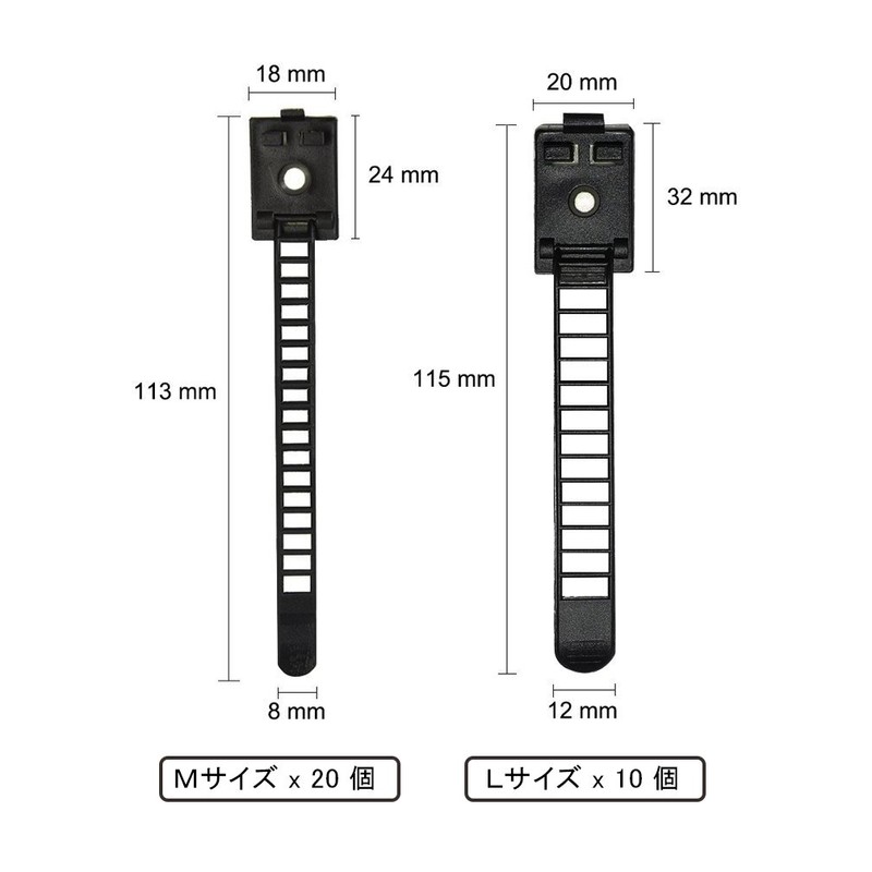 - (2 Types of Sizes) L 4.5 x 0.8 inches (115 x 21 mm) (L x W): 20 x M 4.5 x 0.7 inches (113 x 18 mm) (L x W): A total of 30 adjustable cable ties you can choose according to the number of cables you need to store