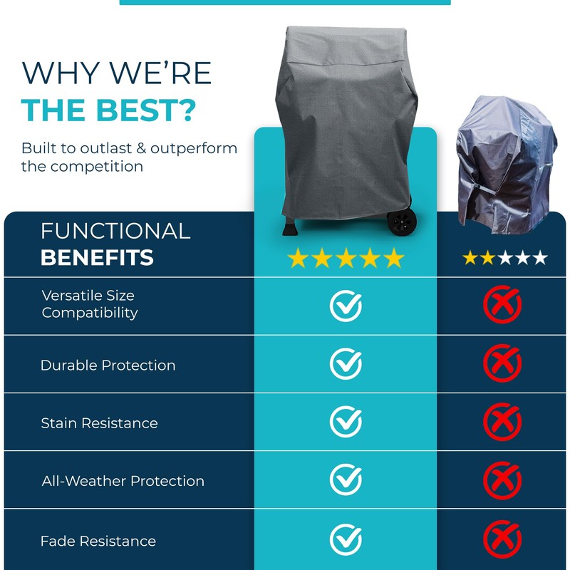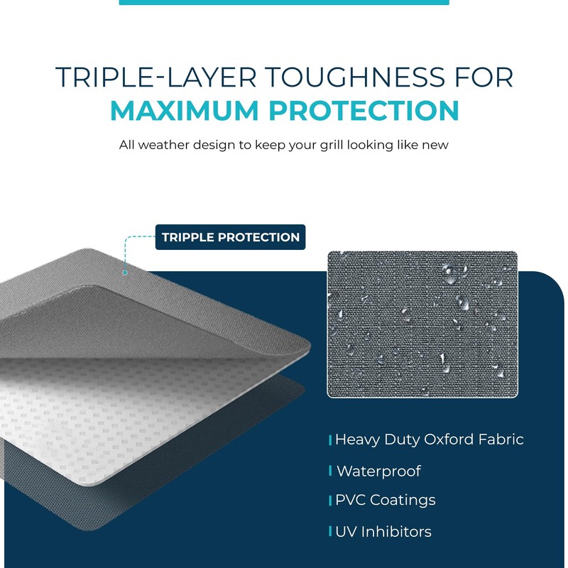 - Durable Ripstop Polyester Construction: Our grill cover is expertly crafted from PVC-coated 600 denier ripstop Oxford fabric, engineered to withstand harsh weather conditions. This barbecue grill cover has UV protection 50+ and a PFAS-free design, protecting your grill from rain, harmful sunlight, and daily wear. Backed by a 1-year warranty on all covers, it ensures reliable, long-lasting protection and peak performance.