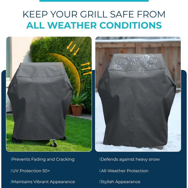 - Elegant Style with Textured Finish: Our heavy duty grill cover features a rich grey color and textured ripstop design, blending functionality with sophistication. The integrated mesh air vents promote airflow to reduce moisture buildup while maintaining a sleek appearance. This grill cover for outside refined aesthetic complements most patio furniture, elevating outdoor decor while delivering reliable, year-round grill protection.