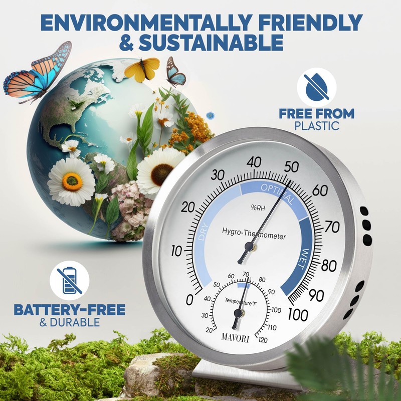 • HIGH-QUALITY MATERIALS: The Mavori indoor hygrometer is designed with a metal casing made entirely out of high-quality stainless steel and glass with no plastic content, making this hygrometer corrosion-proof, durable and reliable!