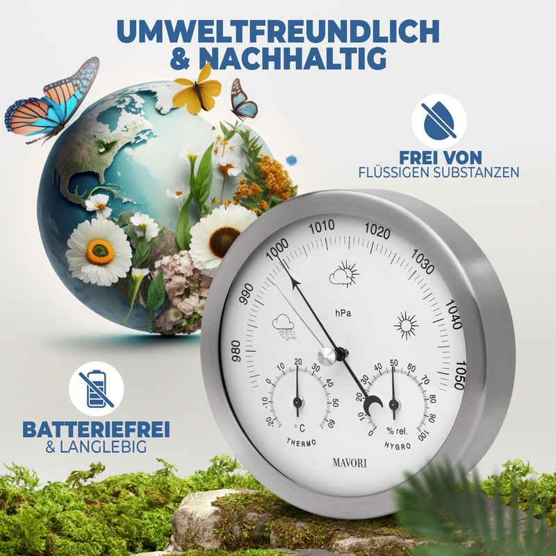 - Sustainable – Unlike digital devices, this quality weather station is operated without batteries and liquid substances, which protects our environment and saves you follow-up costs.