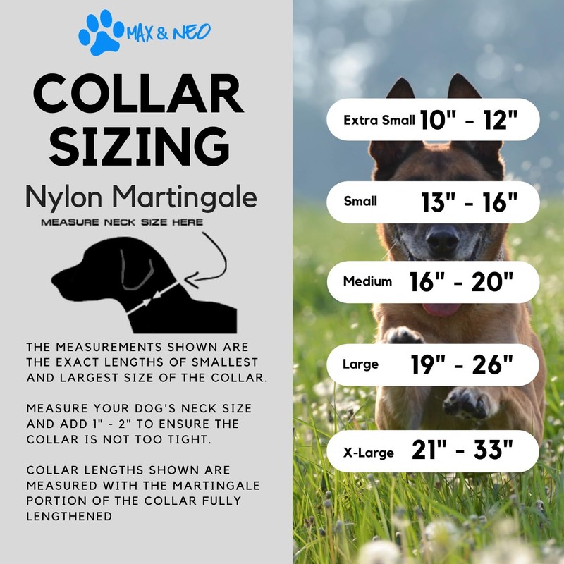 - SIZING for Nylon Martingale: Extra Small - Neck Size 10"-12" / Small - Neck Size 13"-16" / Medium - Neck Size 16"-20" / Large - Neck Size 19"-26" / Extra-Large 21"-33"