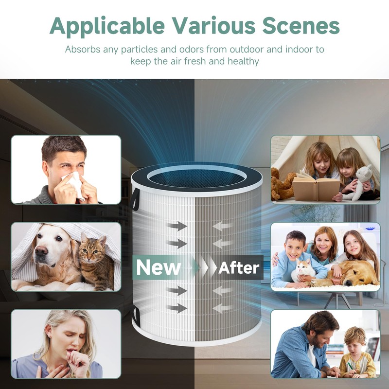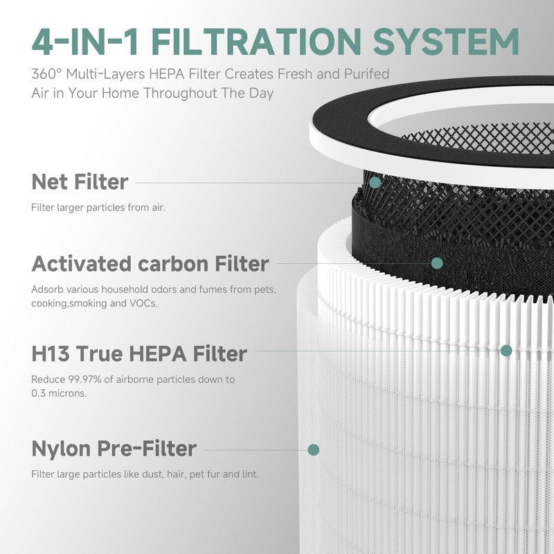 - 𝟑𝟔𝟎° 𝟒-𝐢𝐧-𝟏 𝐇𝐢𝐠𝐡 𝐄𝐟𝐟𝐢𝐜𝐢𝐞𝐧𝐜𝐲 𝐅𝐢𝐥𝐭𝐞𝐫: Our Max filter replacement combines 4 layers including a Fine Primary Filter, H13 True HEPA filter, Activated Carbon Filter & Net Filter, which effectively absorbs tiny particles in the air ensuring you breathe fresh, clean air.