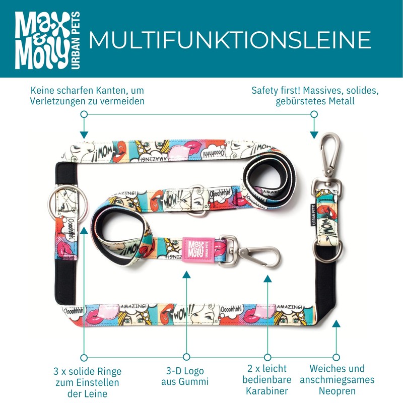 - Description: The Max & Molly multifunctional lead is available in 4 different sizes (XS - L) but is always 200 cm long. 3 additional rings allow you to use the lead in multiple ways e.g. as a shoulder lead, hip lead, short lead, long lead and much more. Practical accessories can of course also be attached to one of the rings. With our selection of many colourful designs, your dog is sure to attract everyone's attention.