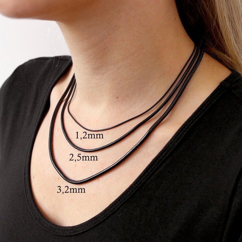 • Skin-friendly stainless steel necklace in 7 lengths (40 cm, 45 cm, 50 cm, 55 cm, 60 cm, 70 cm or 80 cm), 3 thicknesses (strengths) 1.2 mm, 2.5 mm and 3.2 mm available, 4 colours (silver, gold, rose gold or black).