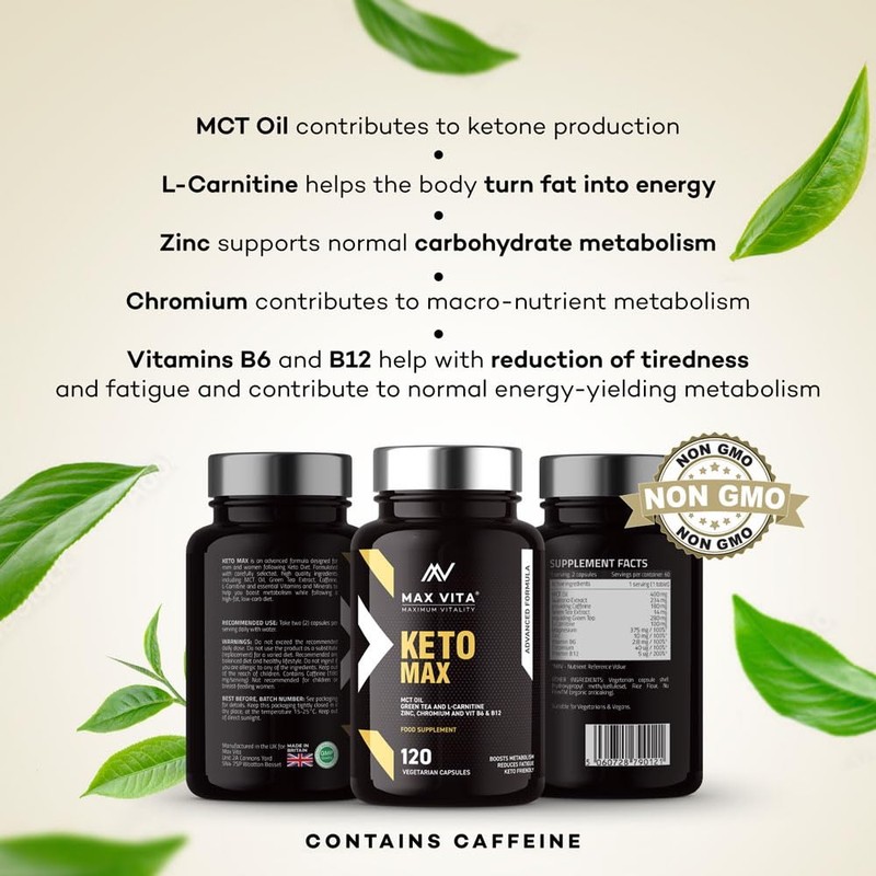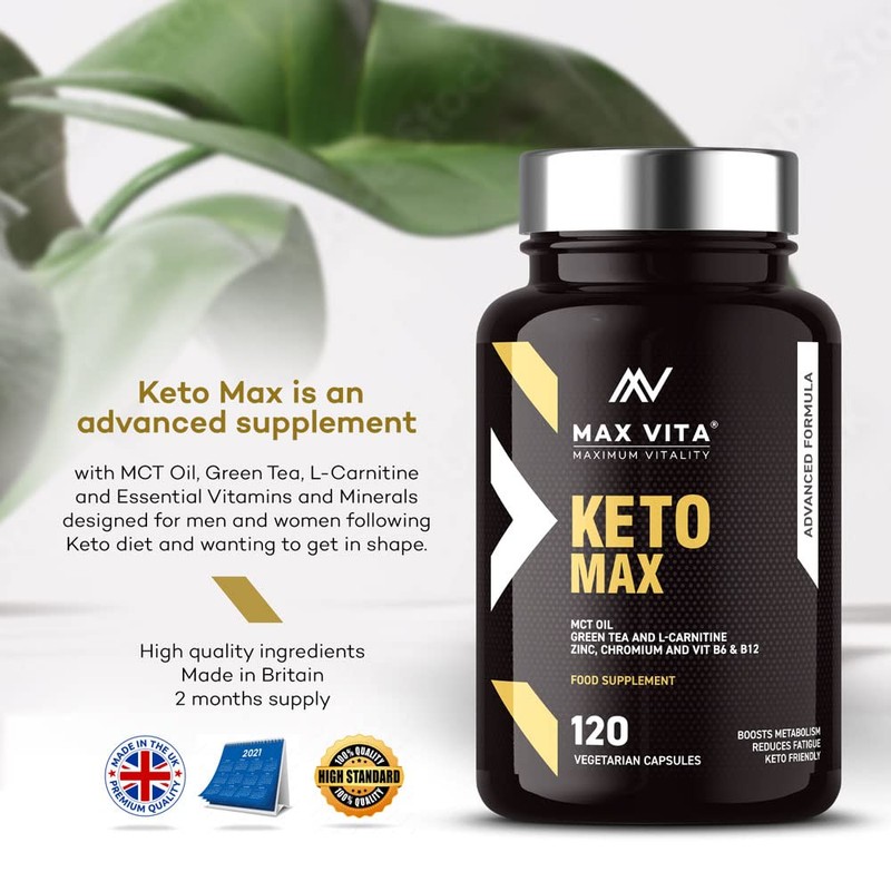 Product descriptionAt Max Vita, we have made your wellbeing a priority. That is why we have chosen to rely on verified suppliers and premium ingredients that allow us to develop new and innovative formulas designed to support your ketogenic diet that can have such a great impact on your body.To help you boost the effectiveness of ketosis, we have developed our British-made keto advanced supplements filled with potent ingredients that can have an amazing effect on your wellbeing. Rich in MCT oil, caffeine, and vitamins, this complete keto supplement is key to turning up your energy levels by burning fat.What makes this product special?This amazing keto active formula contains a special mix of MCT oil, green tea, L-carnitine, zinc, chromium, vitamins B6 and B12, as well as guarana extract and magnesium that work together to help you unlock your full body potential and increase energy levels like never before.Some features to keep in mind about our product:Total count: 120 capsules;Recommended dose: 2 capsules/day;Suitable for vegetarian and vegan diets;Developed to support your keto diet;Made in the UK;Designed for men and women;May help you to boost your metabolism and accelerate the fat-burning process;Could help to reduce fatigue and improve energy levels;Free from harsh fillers;Formulated with vitamins, minerals, and plants extracts.Boost your keto diet with our amazing keto max supplements!IngredientsMCT Oil Powder, Guarana Seed Extract, Green Tea Extract, L- Carnitine l-Tartrate, , Magnesium Oxide, Zinc Citrate Dihydrate, Pyridoxine HCl (Vitamin B6), Methylcobalamin (Vitamin B12), Chromium Picolinate, Vege-tarian Capsule Shell (HPMC), Rice Flour (Bulking Agent), Nu-Flow ((Rice Hulls) Anti Caking Agent)Safety WarningDo not exceed the recommended daily dose. Food supplements must not be used as a substitute for a varied and balanced diet and a healthy lifestyle. If you are pregnant, breastfeeding, taking any medications or are under medical supervision, please consult a doctor or healthcare professional before use. Discontinue use and consult a doctor if any adverse reactions occur. Not intended for use by persons under the age of 18.