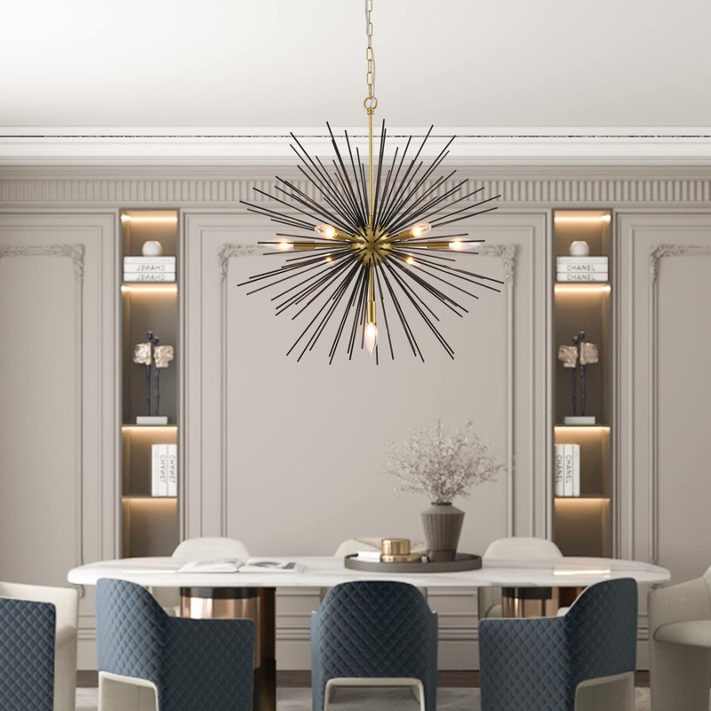- Minimalist Design: Greet guests with a warm and welcoming glow in the entryway or dress up your dining room for an upcoming dinner party with this eye-catching chandelier. Sure to make a statement in any setting, it is a metal frame that takes on a sputnik-inspired silhouette with bursting rays all finished in black/gold for a glint of glamour. 7 lights are distributed throughout, each exposed to create an even gleam