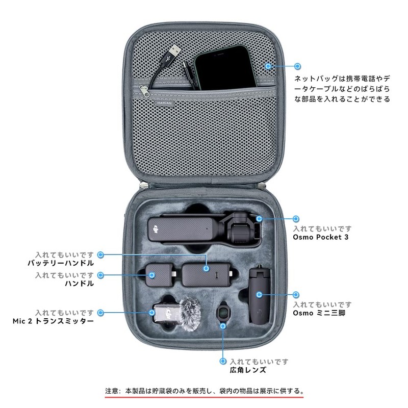 - Designed for DJI Osmo Pocket 3 Creator Combo Capacity:1 x Osmo Pocket 3 Creator Combo,1 x PD Compliant Cable,1 x Protective Cover,1 x Osmo Pocket 3 Handle (with 1/4" screw hole),1 x Wide Angle Lens, 1 x DJI Mic 2 Transmitter, 1 x DJI Mic 2 Windscreen, 1 x Osmo Pocket 3 x SD Cards and other accessories. There is a pocket on the top lid to expand the storage capacity and store cables etc. Note: Camera and other accessories are not included